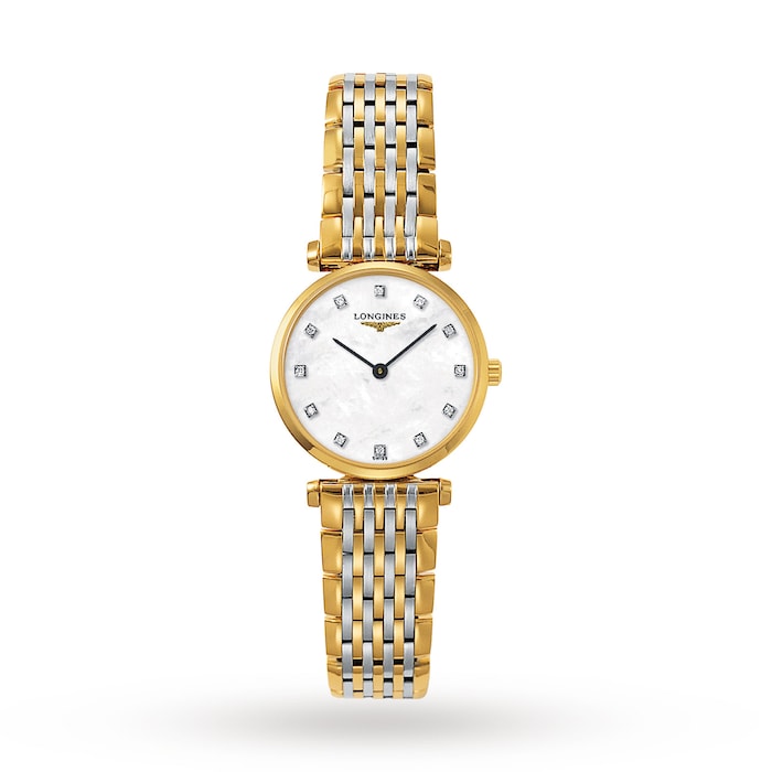 - White mother-of-pearl dial completed with 12 diamond hour markers