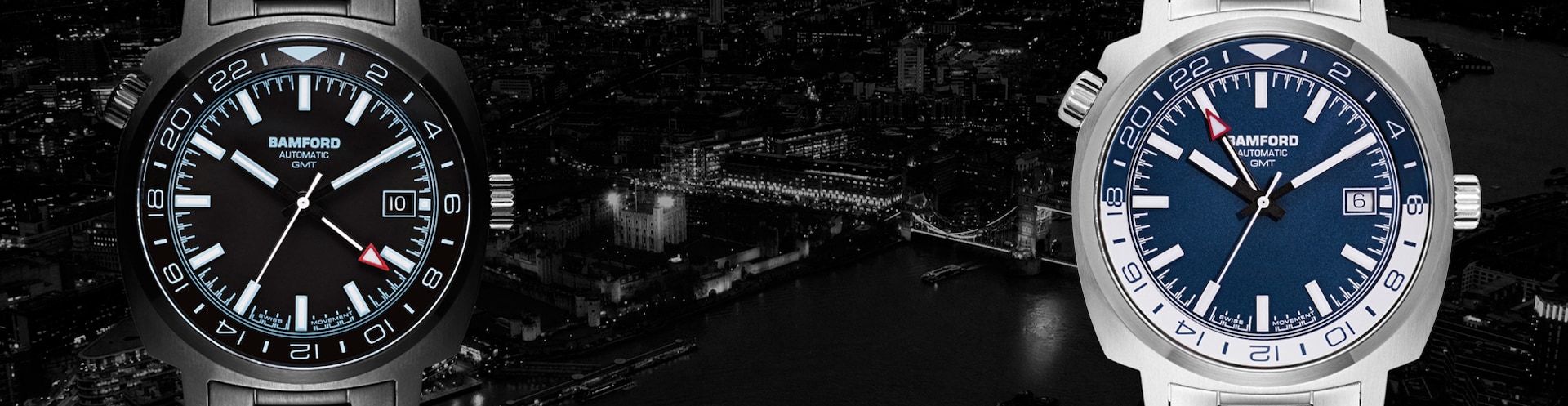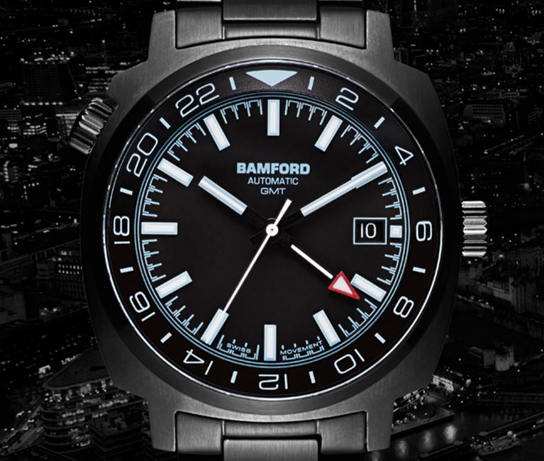 Inspired by travel, the 24-hour GMT hand function of these Bamford watches with an internal rotating bezel allows users to view a separate time zone.
